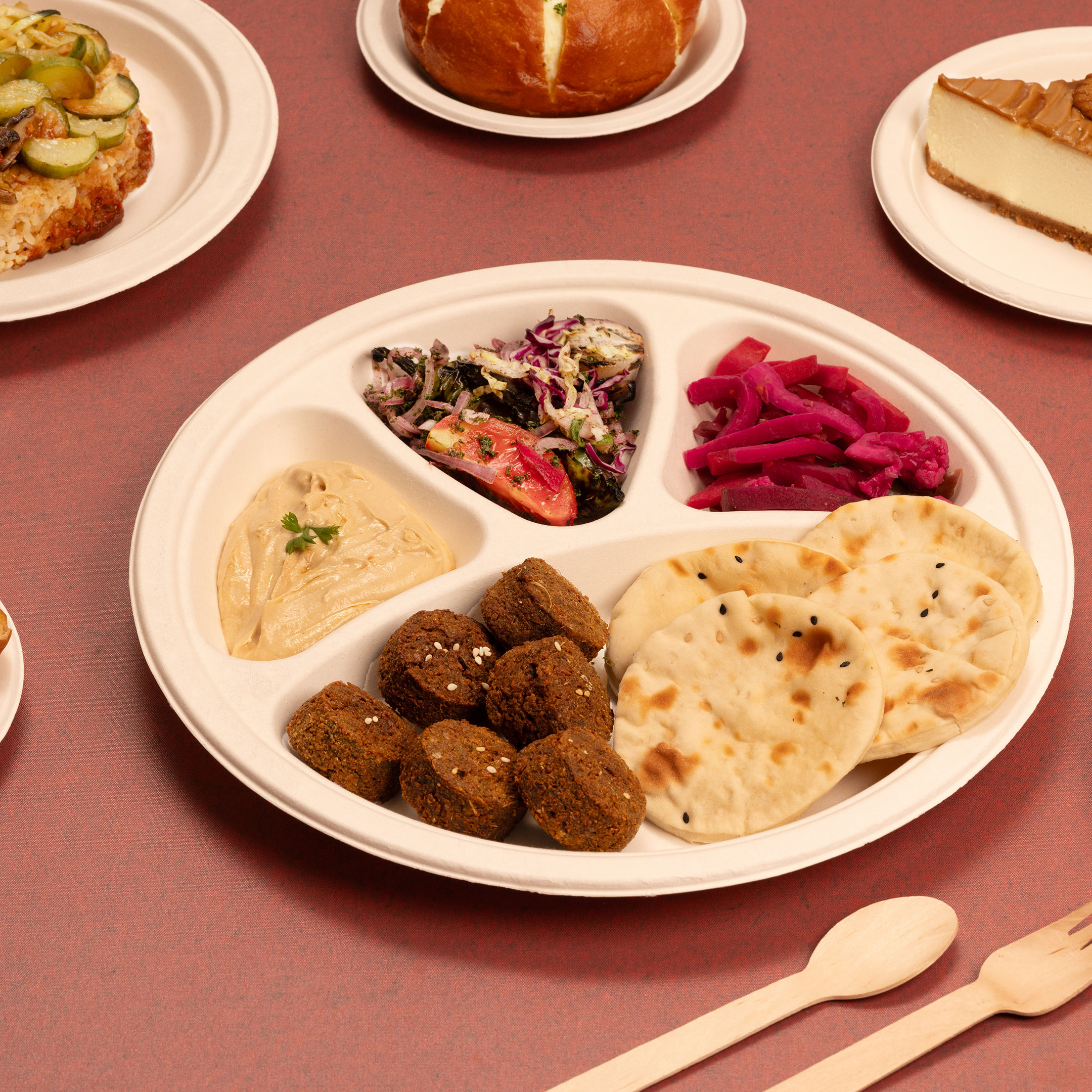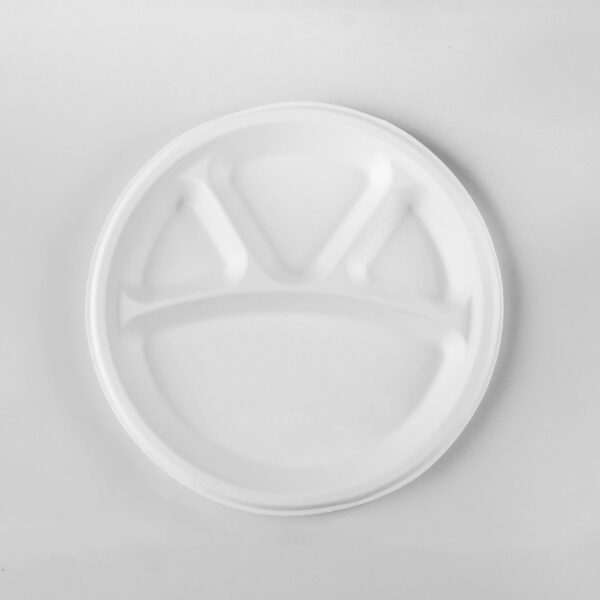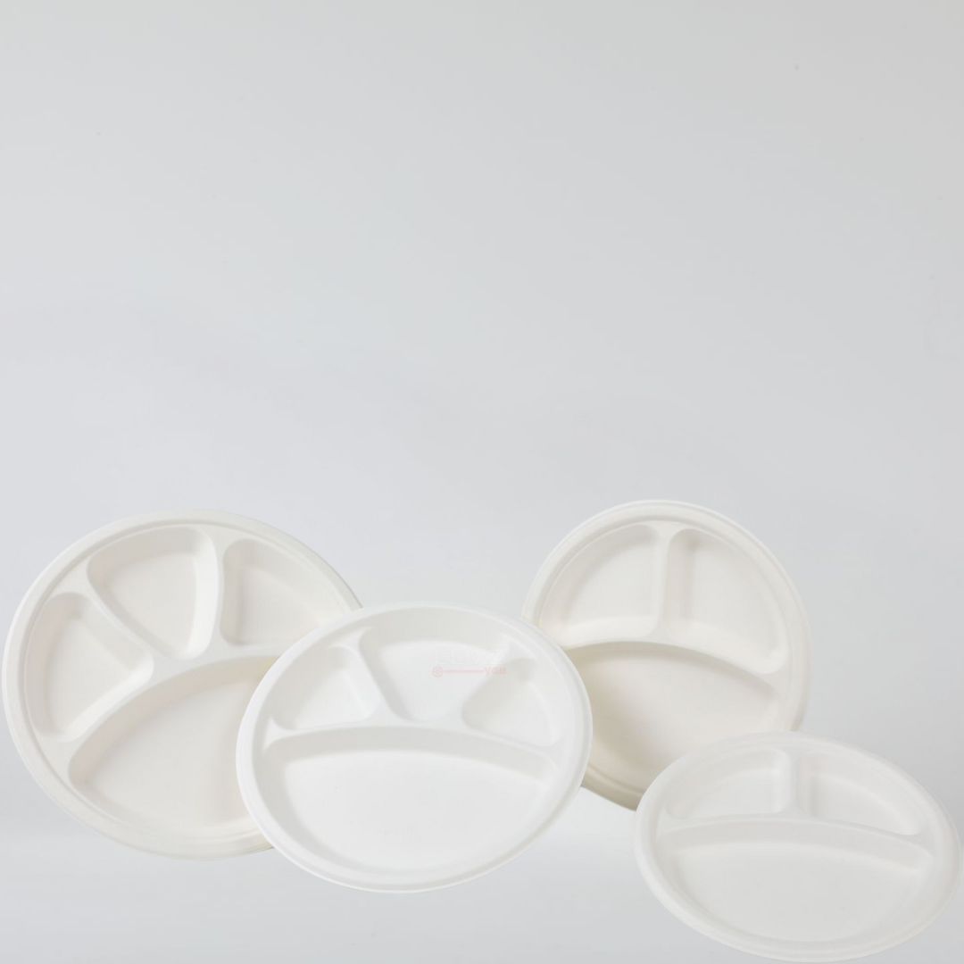 Enjoy perfectly portioned meals with our thoughtfully designed compartment plate, crafted from natural sugarcane bagasse. The spacious 11-inch diameter features one large main section and three smaller compartments, ideal for keeping dishes separated while serving complete meals.